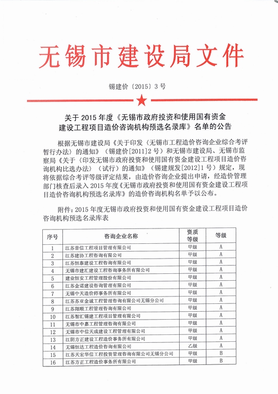 2015年度《无锡市政府投资和使用国有资金建设工程项目造价咨询机构预选名入库》名单的公告