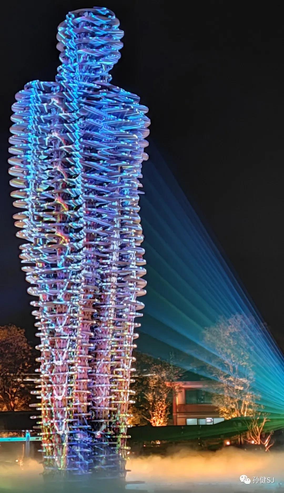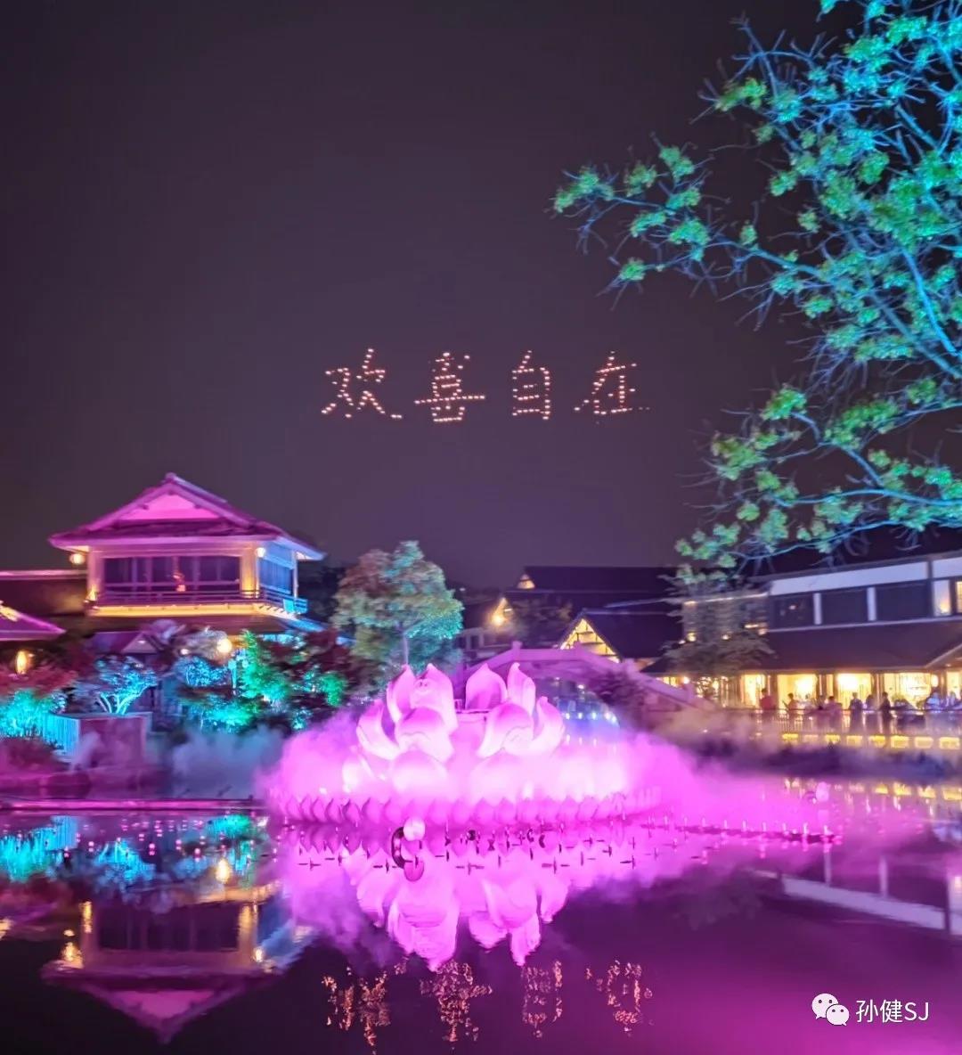 跟随众人脚步,我们来到最后一处景点——拈花一笑动态雕塑演艺。18米高动态雕塑分合变幻,300架无人机闪耀星空。