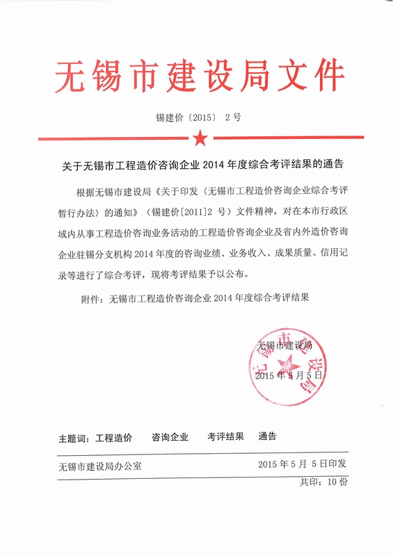 我公司在无锡市工程造价咨询企业2014年度综合考评中荣获等级A