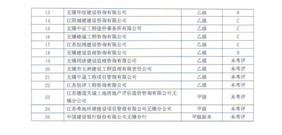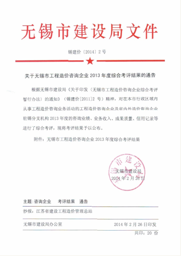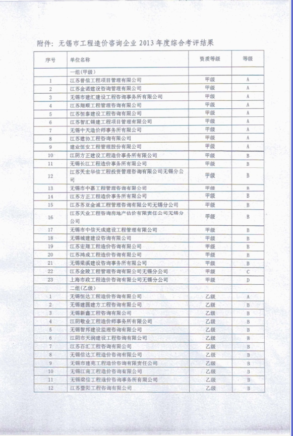无锡市工程造价咨询企业2013年度综合考评结果通告