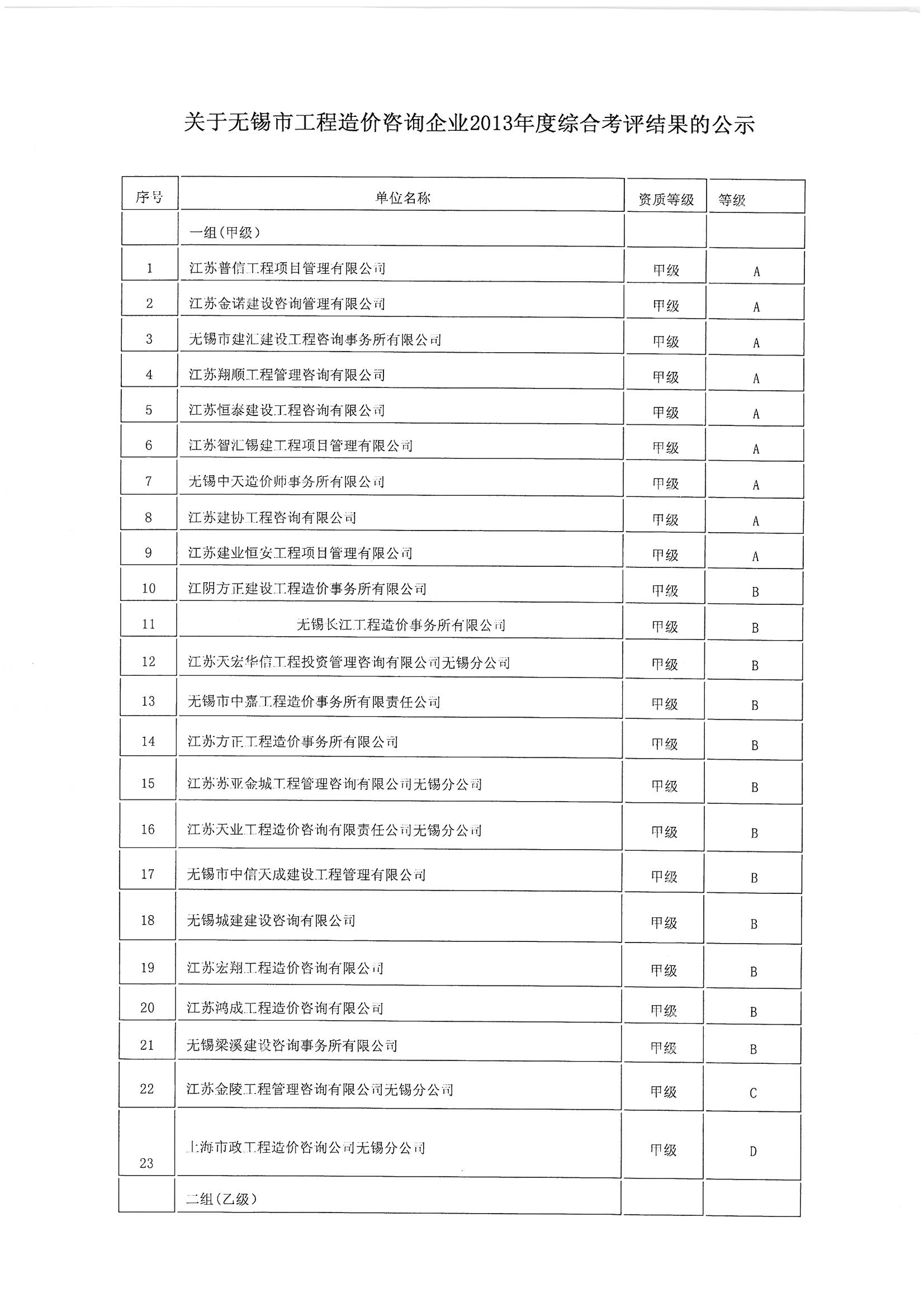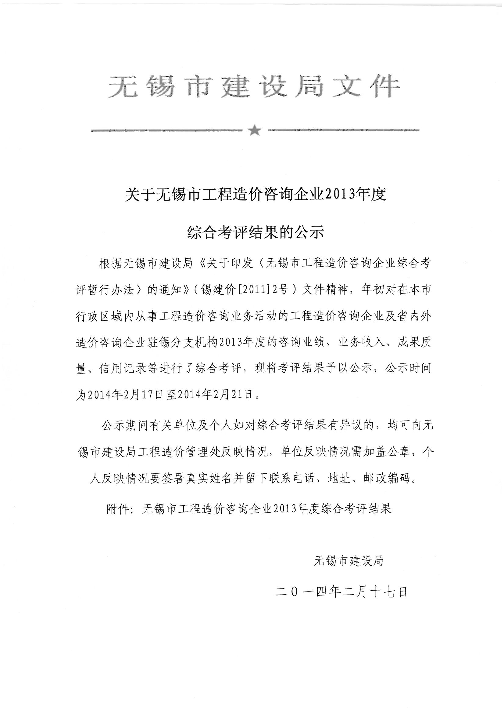 关于无锡市工程造价咨询企业2013年度综合考评结果的公示